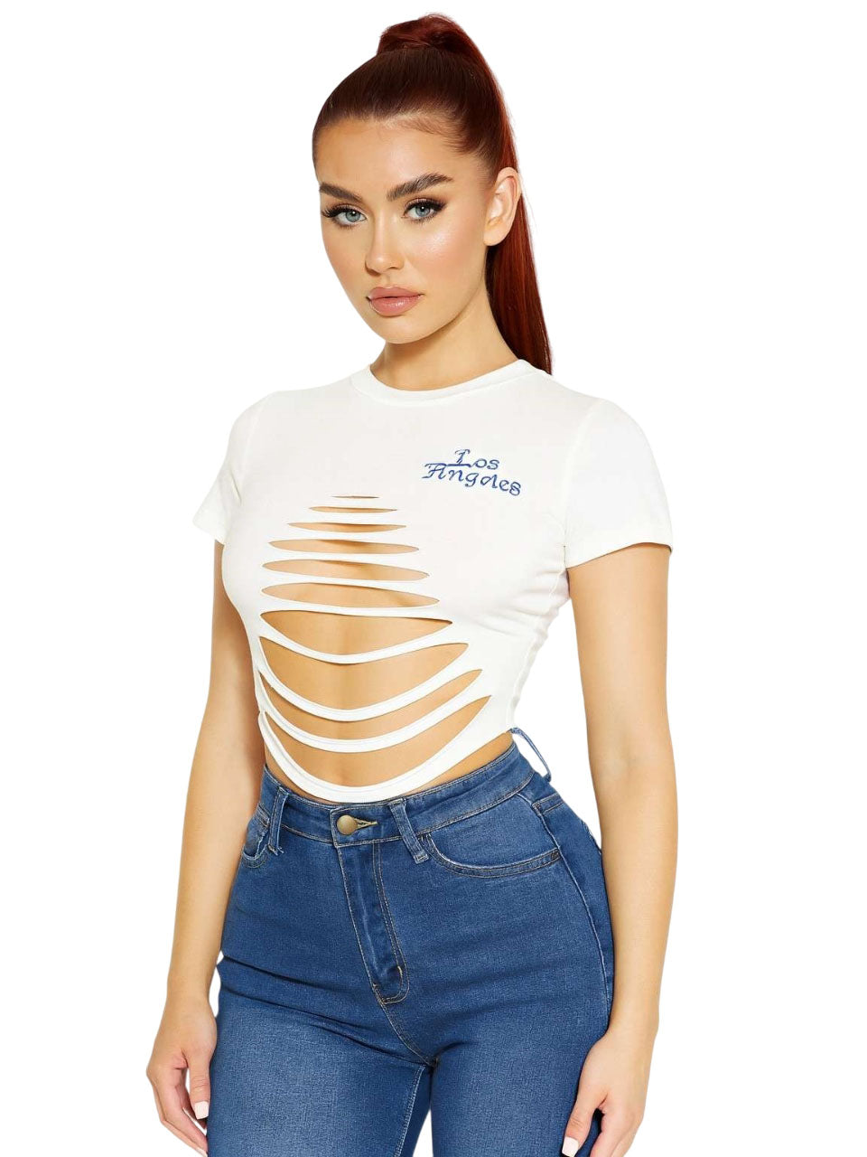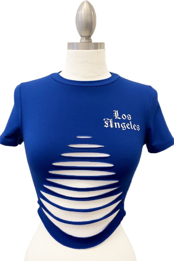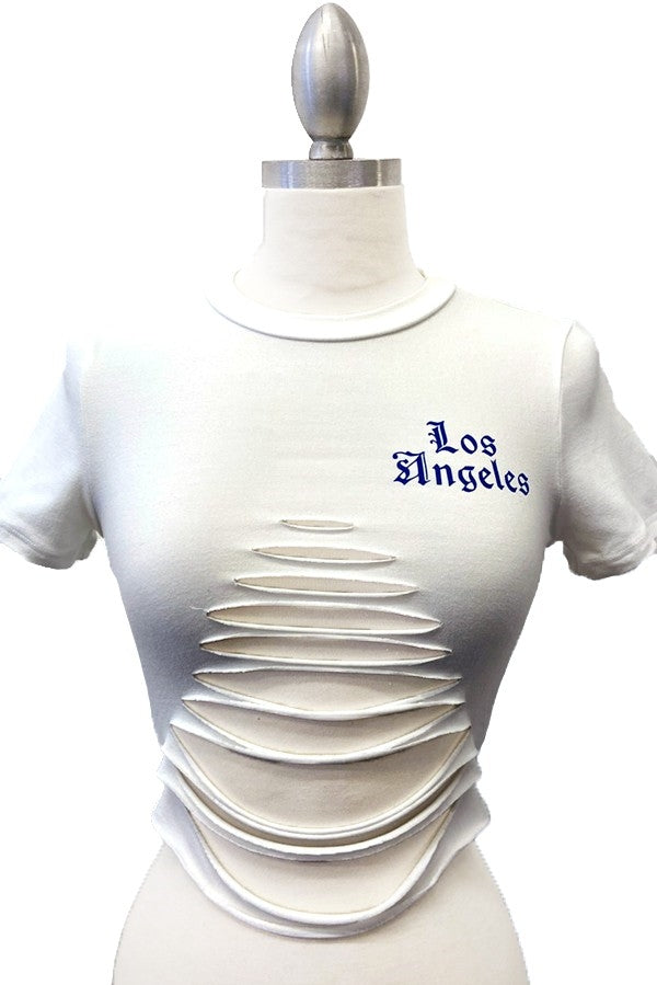 LOS ANGELES LETTER PRINT LASER CUT SHORT SLEEVE CROP