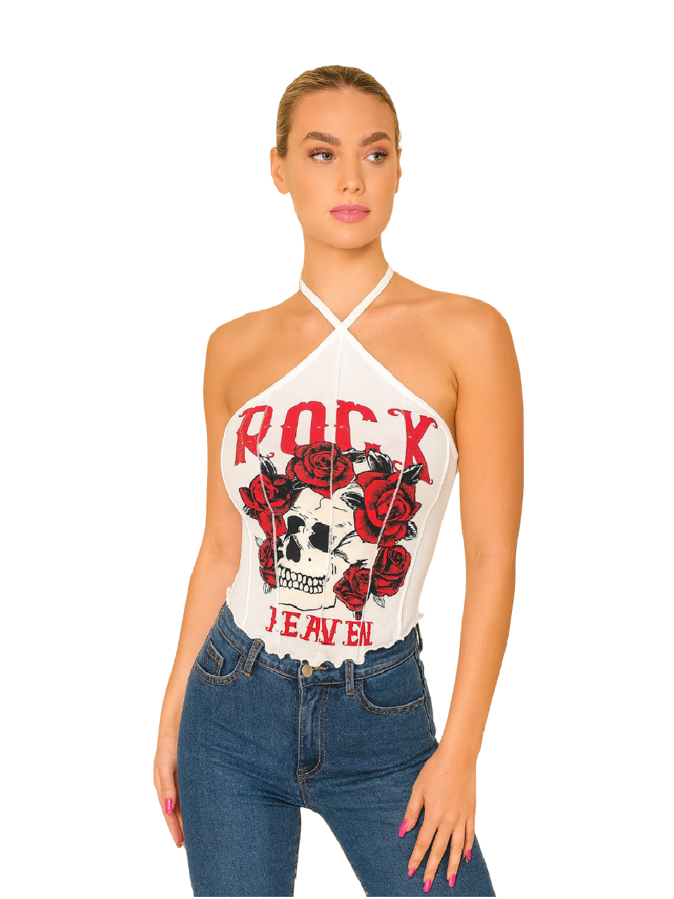 Turn heads with this bold halter top featuring a crossed neckline and a fitted silhouette that flatters every curve. Designed with a striking skull-and-rose graphic and “ROCK HEAVEN” lettering, this top brings the perfect mix of edgy and feminine energy. The soft, stretchy fabric keeps it comfortable for all-day wear, while the raw-cut hem adds an authentic rock-inspired vibe.