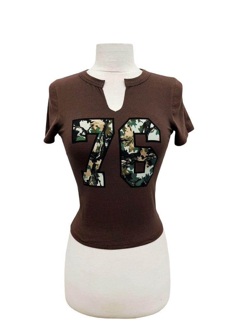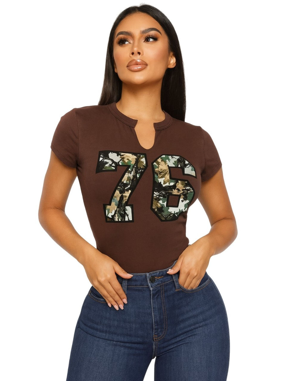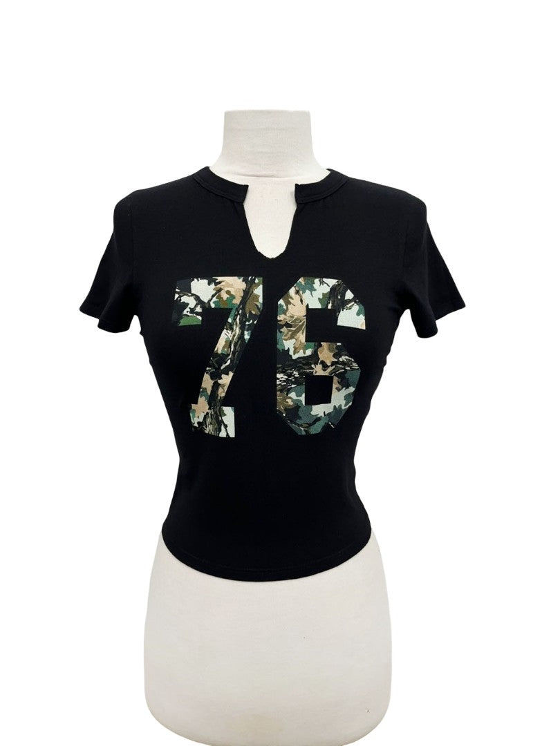 Camouflage '76' Graphic Notch Neck Fitted Crop Top