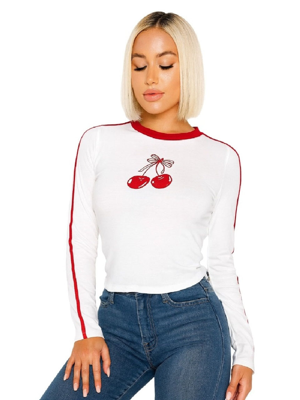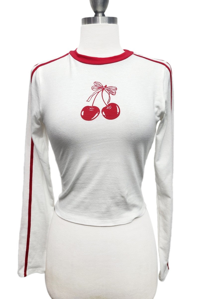 LONG SLEEVE CHERRY GRAPHIC PRINT TOP